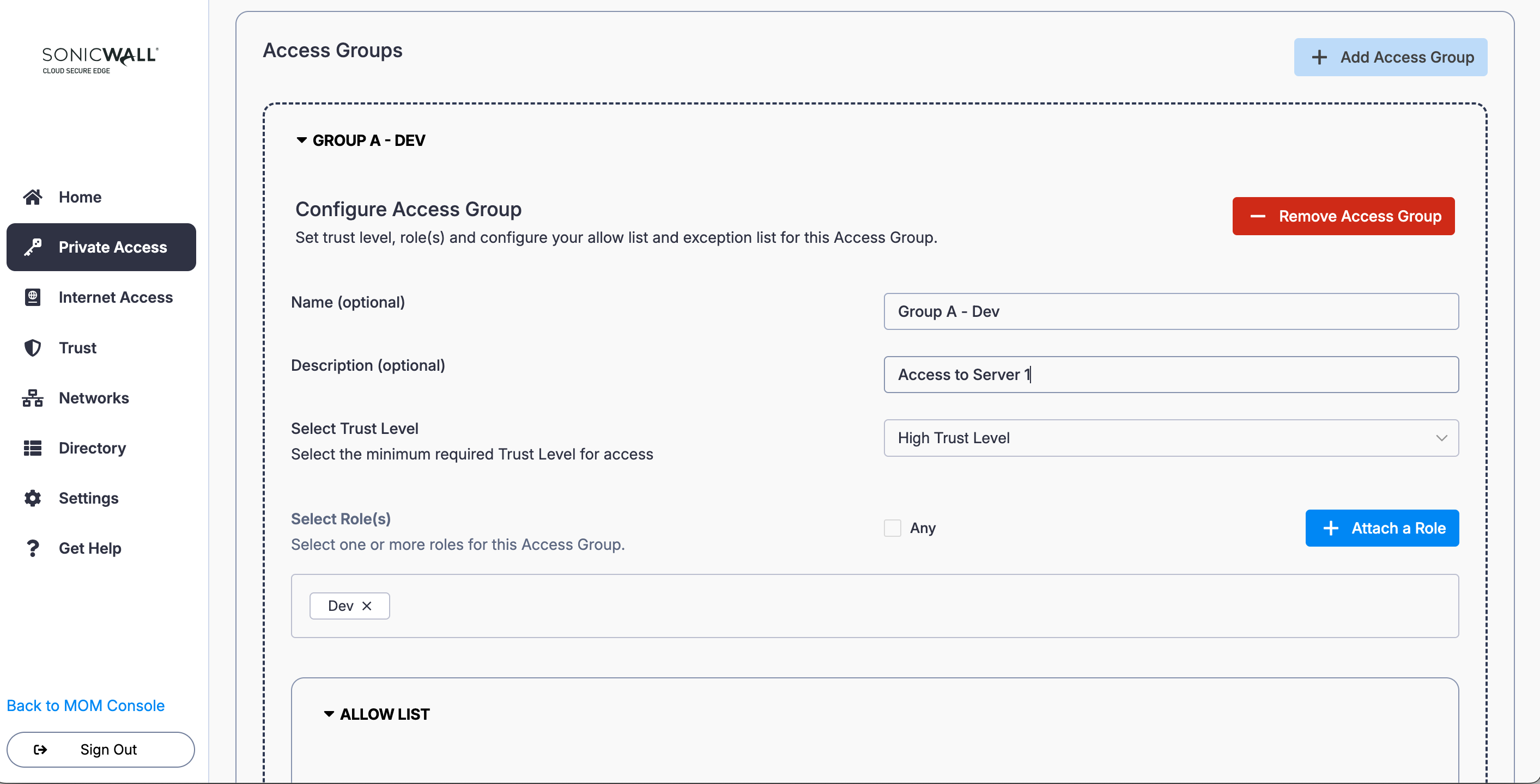 6. Add a second Access Group (i.e., select the + Add Access Group button again): Name the Access Group (i.e., Private Network 1) and enter a meaningful description (i.e., Private Network 1 Access for Group A). Set a required device Trust Level.