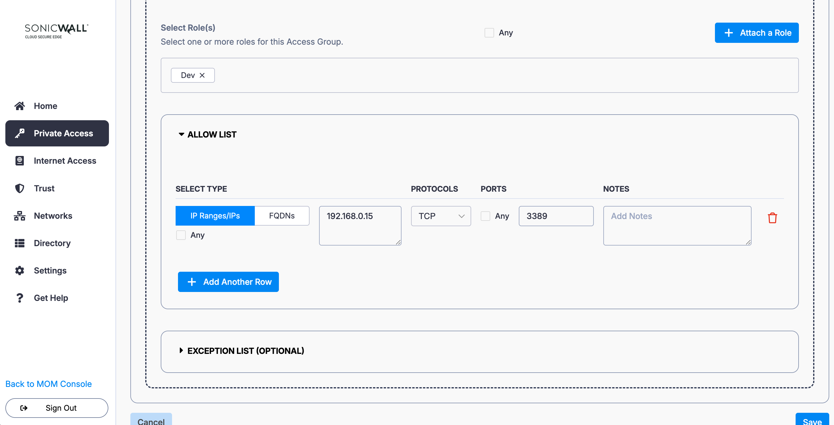 4. Under Allow List, select IP Ranges/IPs: Enter the IP of Server 1 (i.e., 192.168.0.15), and select the relevant protocol (i.e., TCP) and port (i.e., 3389).