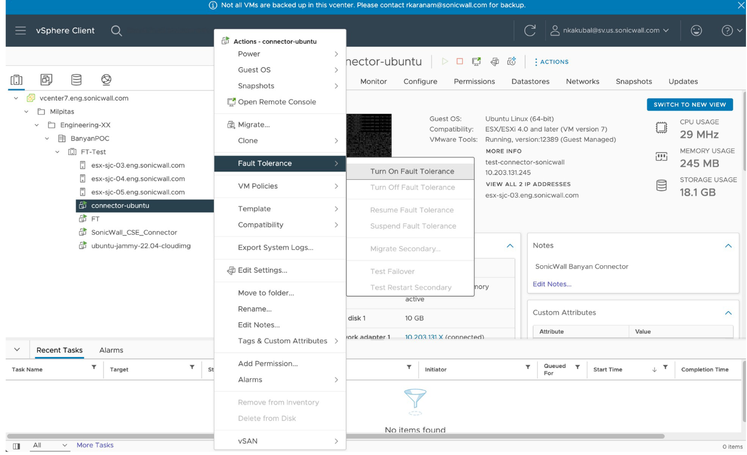 - On your vSphere Client, turn on the Fault Tolerance setting.