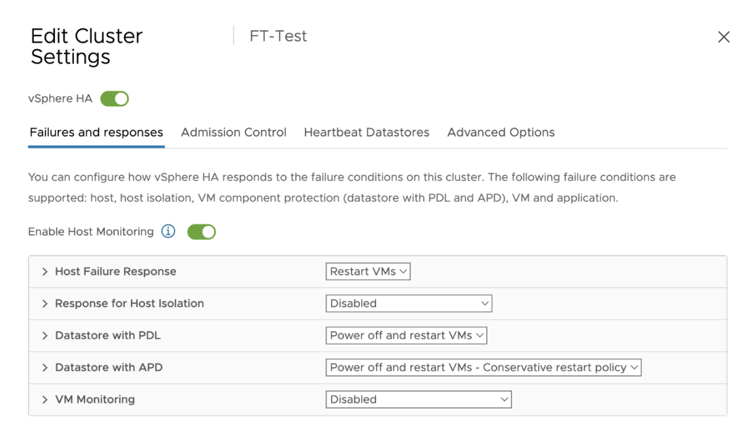 - Toggle on Enable Host Monitoring and configure necessary failure conditions on your cluster.