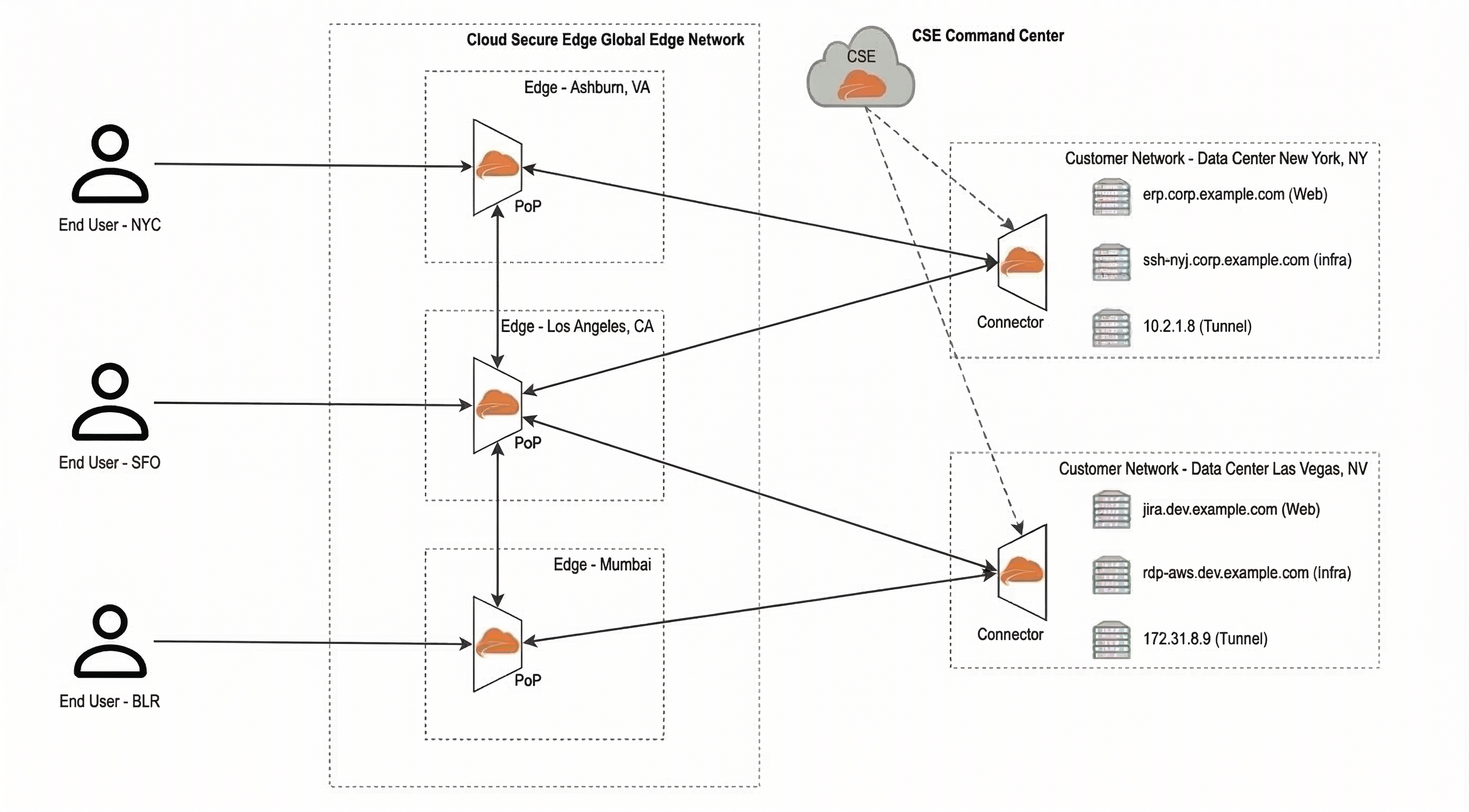 A Connector is deployed in the customer network, and it dials out to establish a secure encrypted tunnel with one or more PoPs in the Global Edge Network.