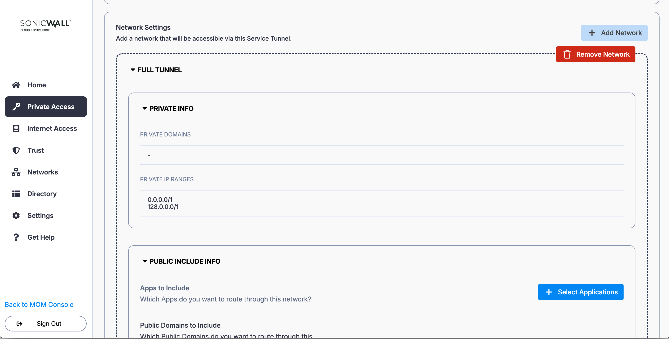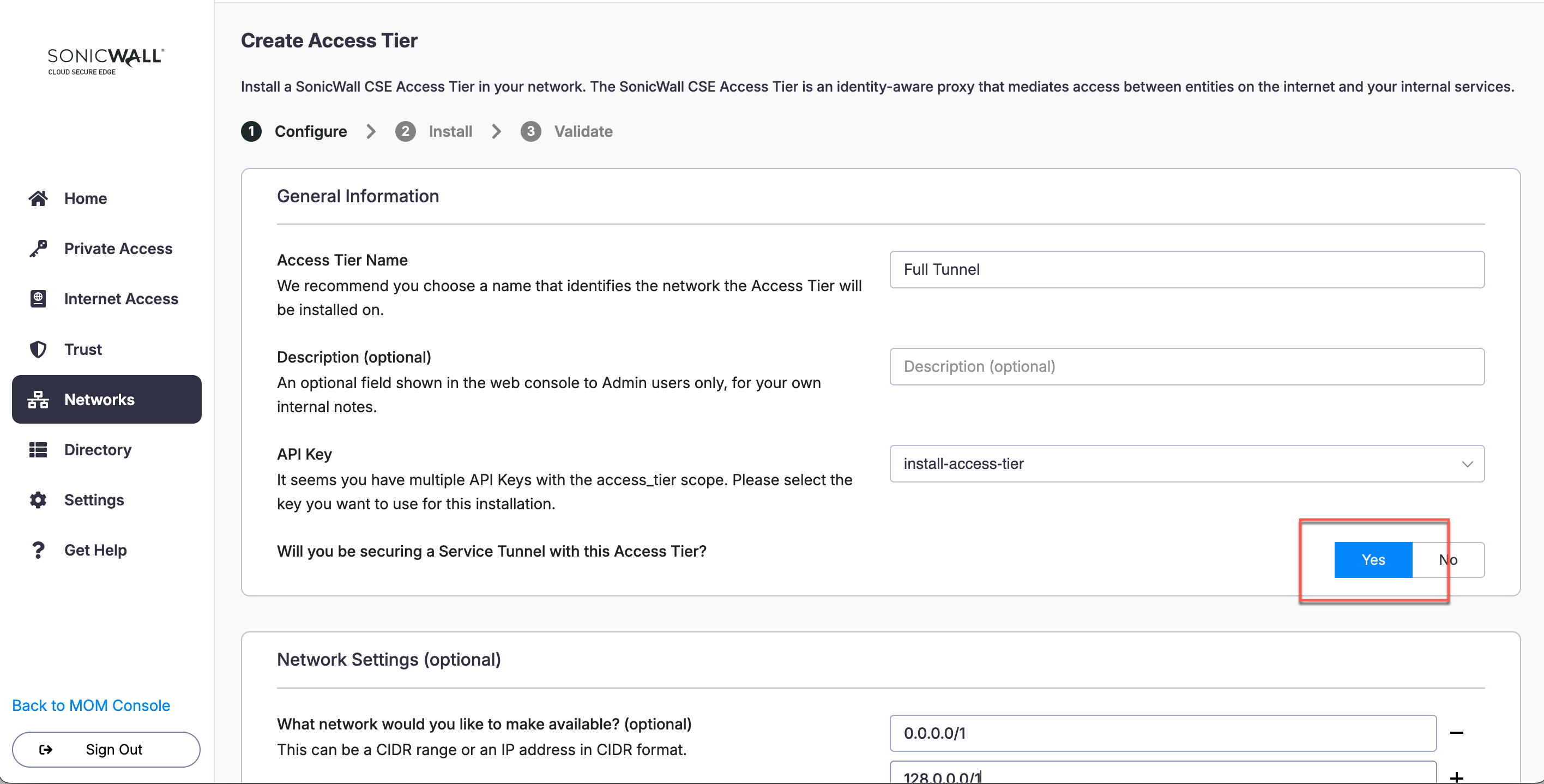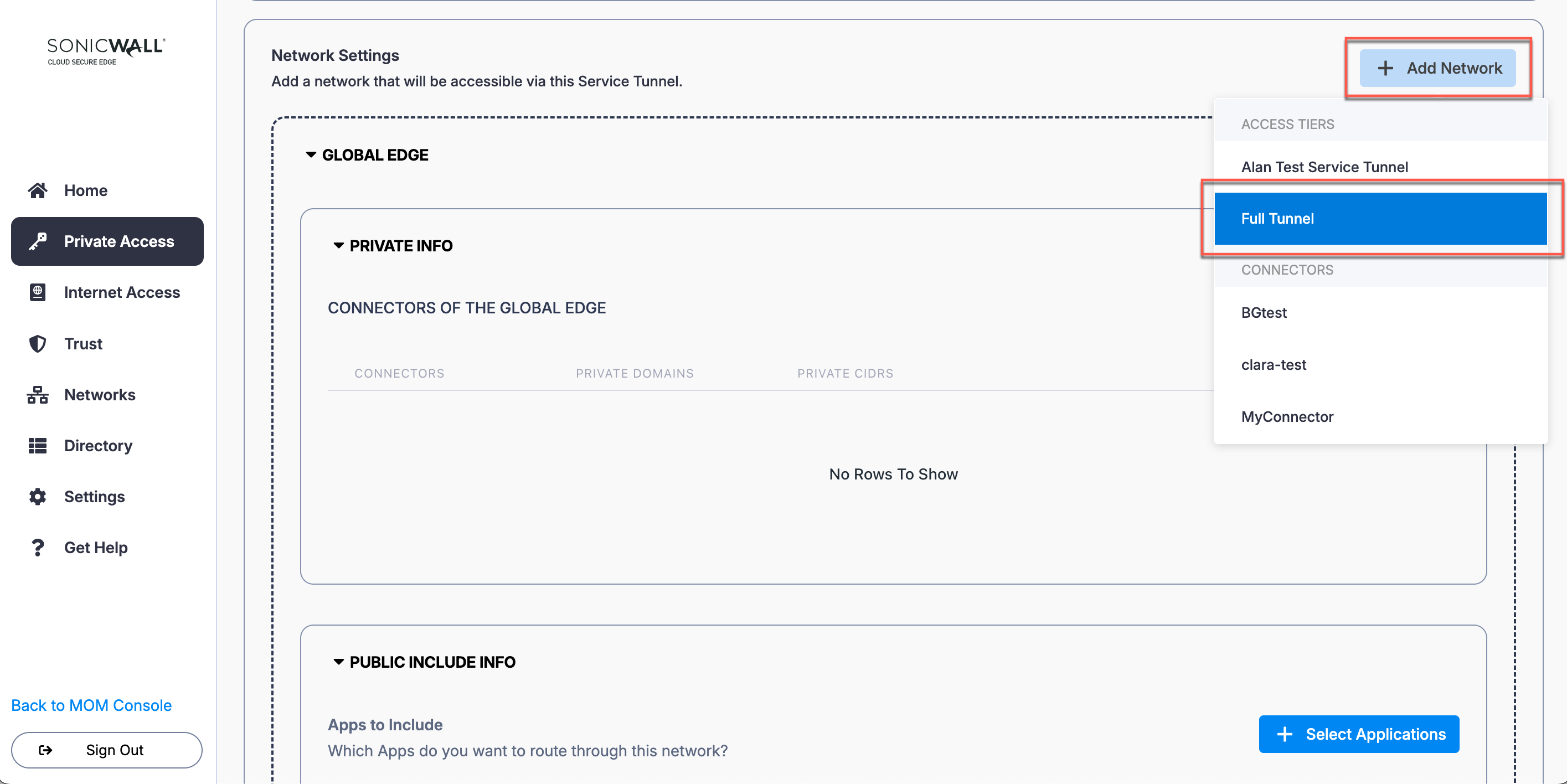 2.2 In the Service Tunnel configuration, select Add Network. Select the Access Tier configured in Step 1 from the dropdown menu.