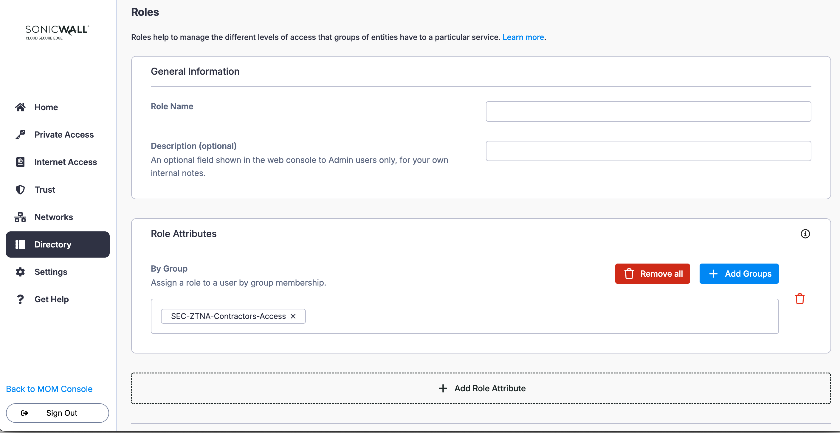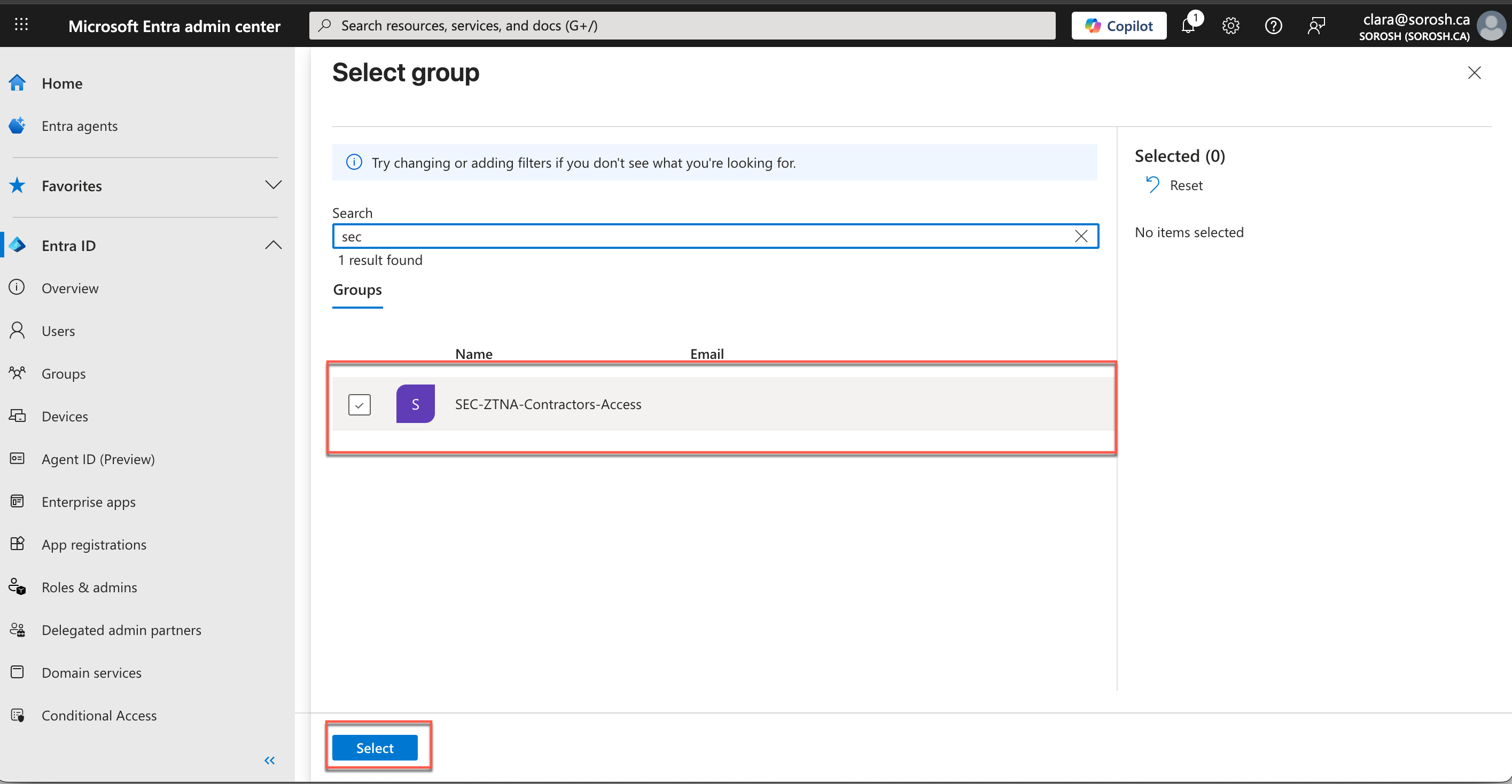 2.5 Under the Groups and Roles tab, select + Add group, and search for and select the SEC-ZTNA-Contractors-Access group (created in Section 1); Select this group.
