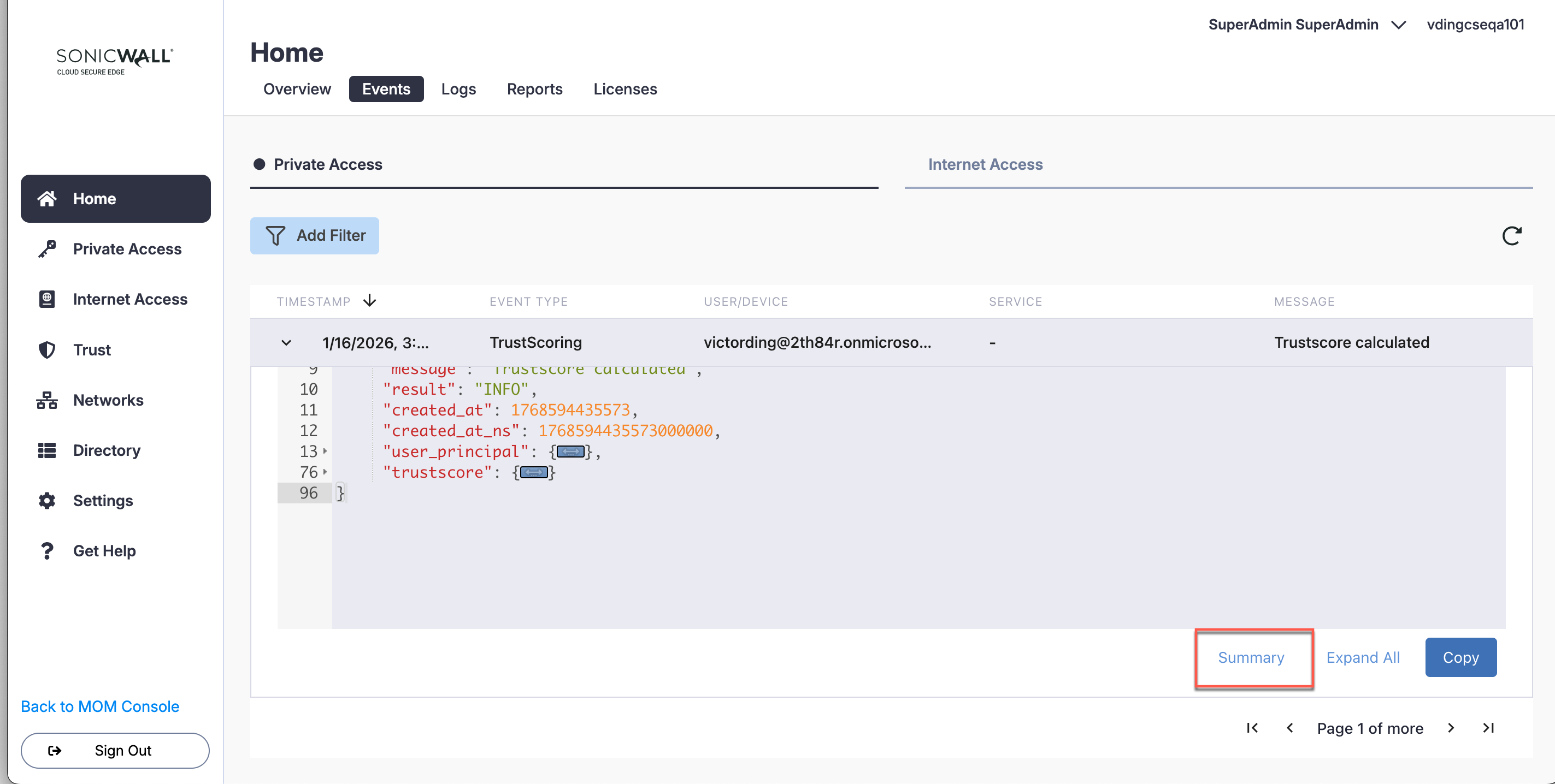 To view an AI-generated summary of a particular Private or Internet Access event, select Summary.