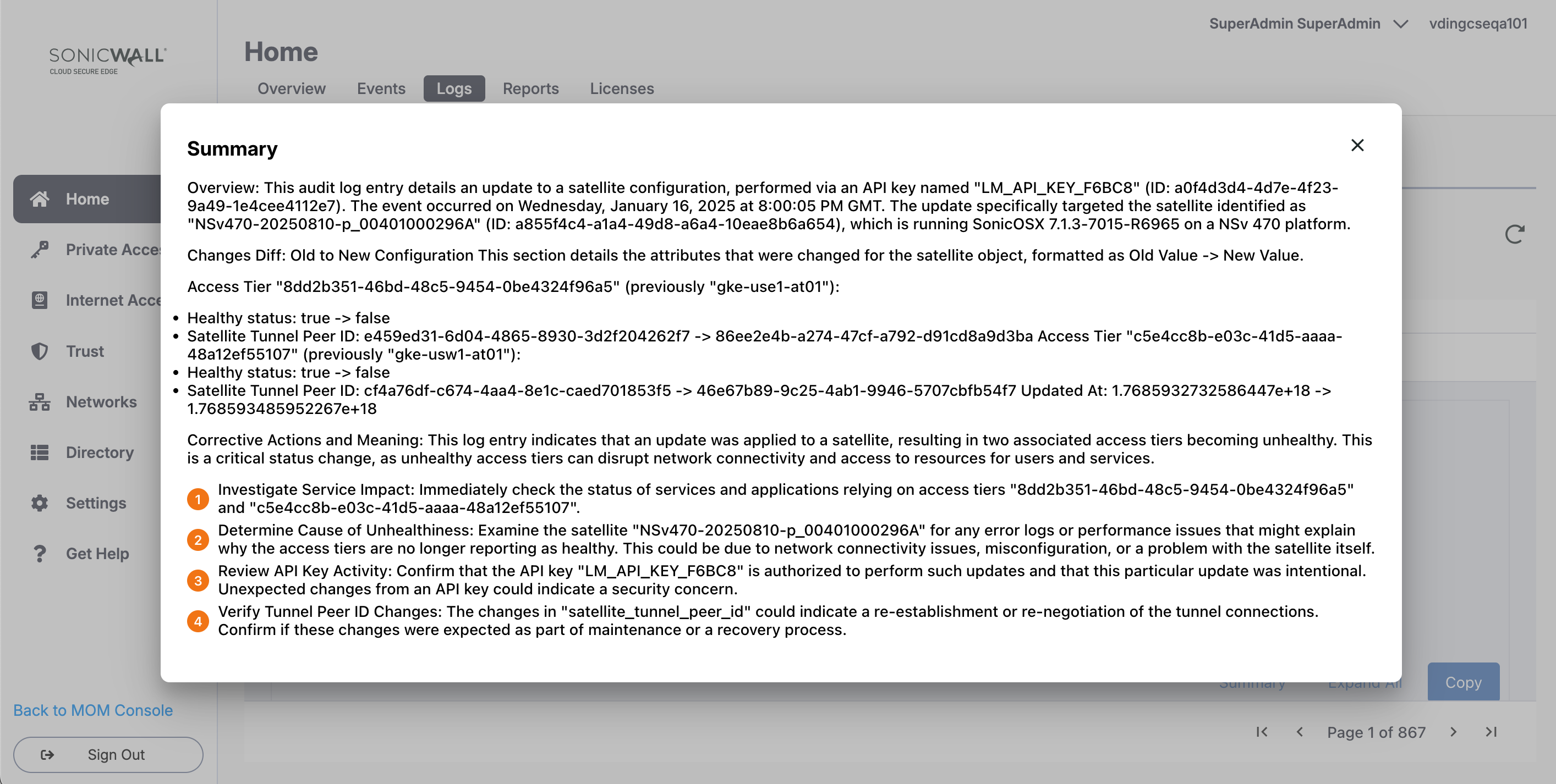 Review detailed logs of administrator activity in your Cloud Secure Edge organization